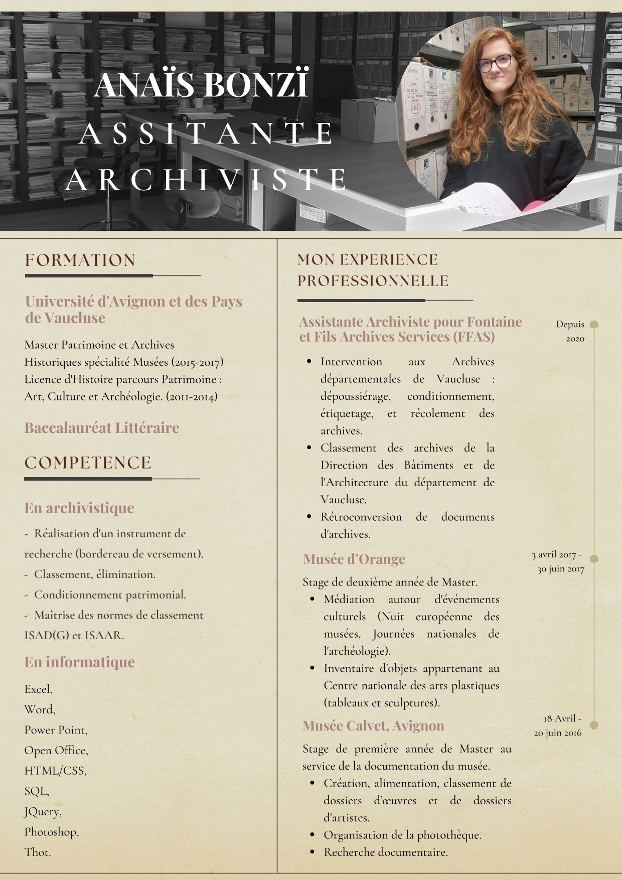 Anaïs a intégré FFAS lors du projet de dépoussiérage et de reconditionnement de 14 kml d’archives pour les Archives départementales de Vaucluse en 2020. Elle maîtrise ainsi parfaitement la gestion de flux important de documents avec l’enchainement d’étapes de traitement. Depuis deux ans, elle participe au classement, à la rédaction de bordereaux de versement et d’élimination.