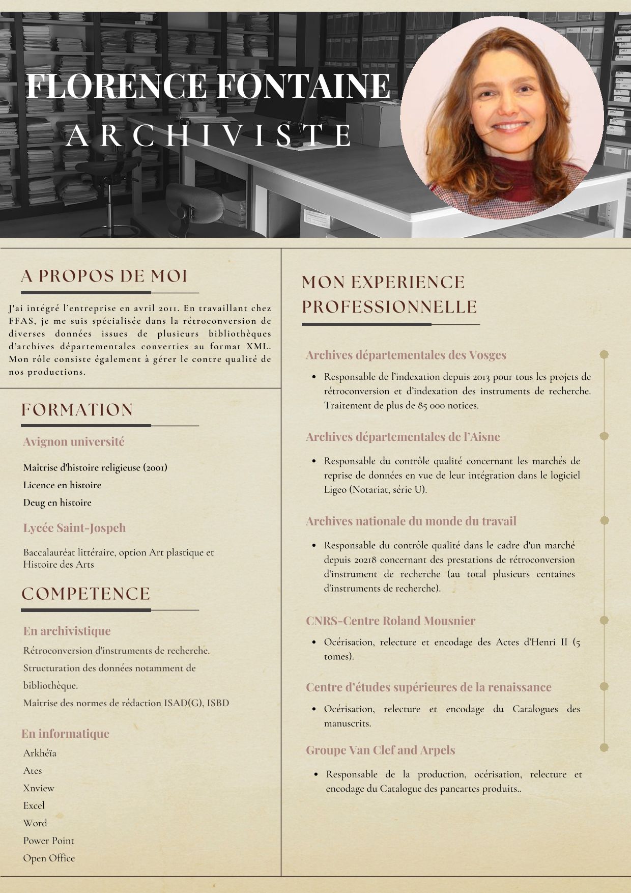 Florence possède une Maîtrise d'histoire religieuse contemporaine. Elle a intégré l’entreprise en avril 2011. Elle s'est spécialisée dans la rétroconversion de diverses données issues de plusieurs bibliothèques d’archives départementales converties au format XML. Depuis 3 années elle encadre un projet de saisie de données pour l'entreprise Van Cleef Arpels.