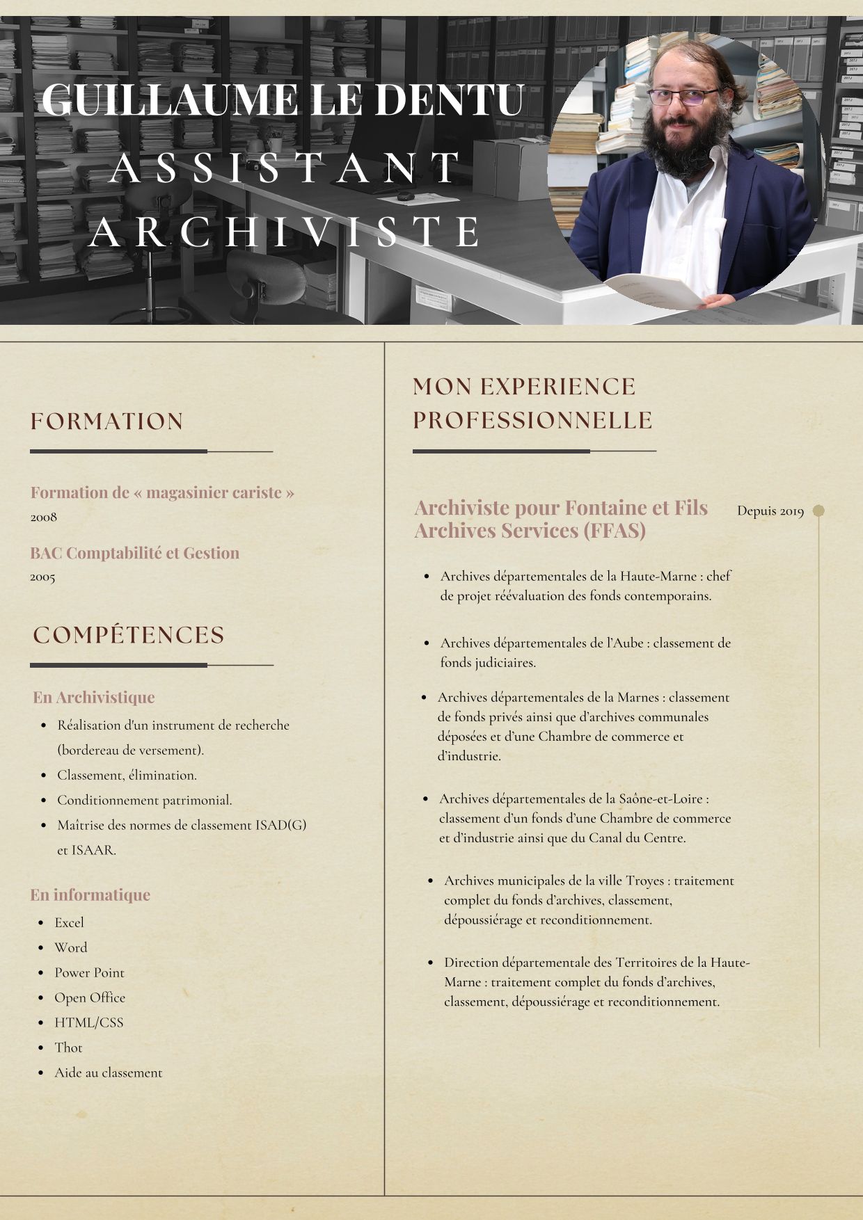 Guillaume est employé par FFAS depuis plusieurs années sur des chantiers de traitement d'archives notamment pour la partie magasinage, étiquetage, vérification des récolements, saisie de descriptions archivistiques. Très méticuleux et curieux du métier, il a su se passionner pour son travail. Il encadre actuellement un projet de réévaluation des fonds aux Archives départementales de la Haute-Marne.