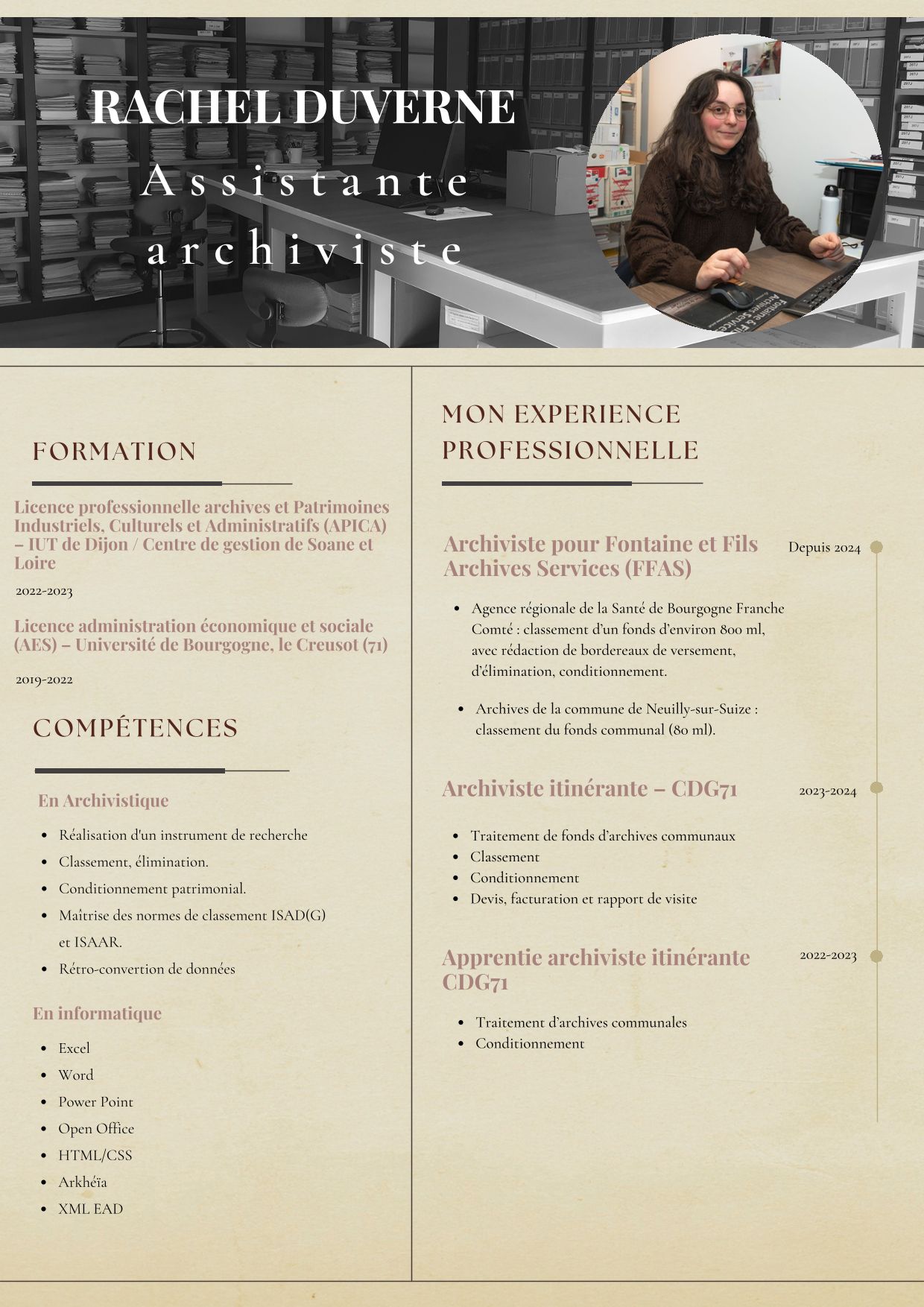 Rachel a rejoint FFAS en août 2024. Sa mission principale consiste au classement d'un fonds très important (800 ml) de l'Agence régionale de la santé de Bourgogne Franche Comté.